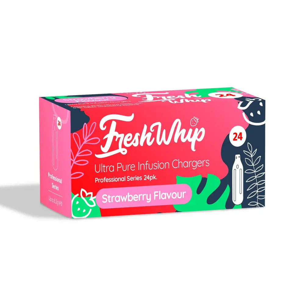 Heben Sie Ihre Desserts und Getränke mit der Strawberry Edition der FreshWhip Professional Series Sahnekapseln auf ein neues Level. Jede Kapsel enthält 8,2 g ultrareines Distickstoffmonoxid (N₂O) und ist mit einer leichten Erdbeer-Note versetzt – perfekt, um Schlagsahne, Mousse, Cocktails und mehr geschmacklich zu verfeinern.